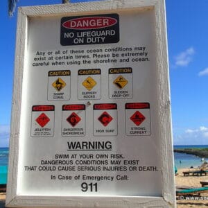 Several signs have been set up on the beach with safety instructions. Make sure you read them before entering the water. Although the beach is partly occupied by the hotel complex, there is never any lifeguards.