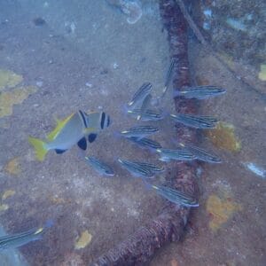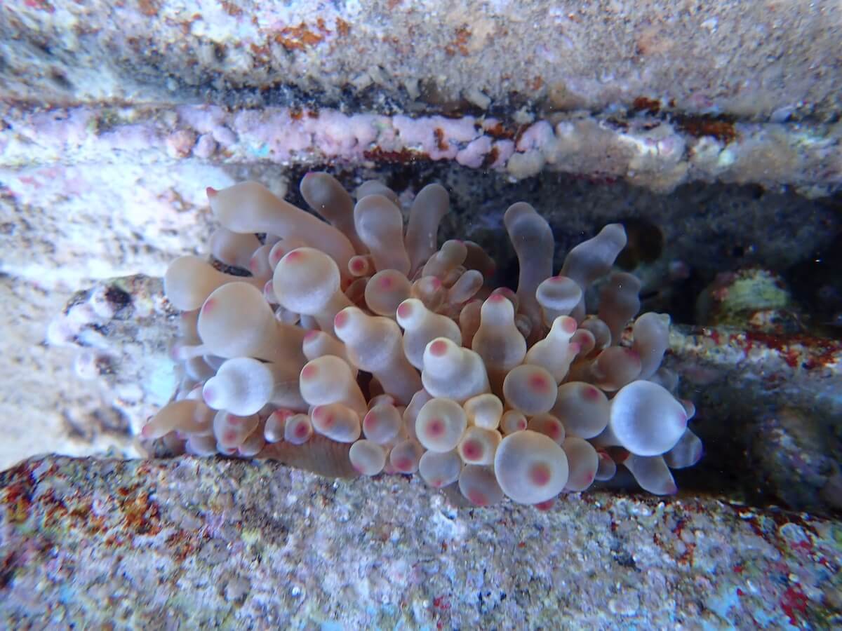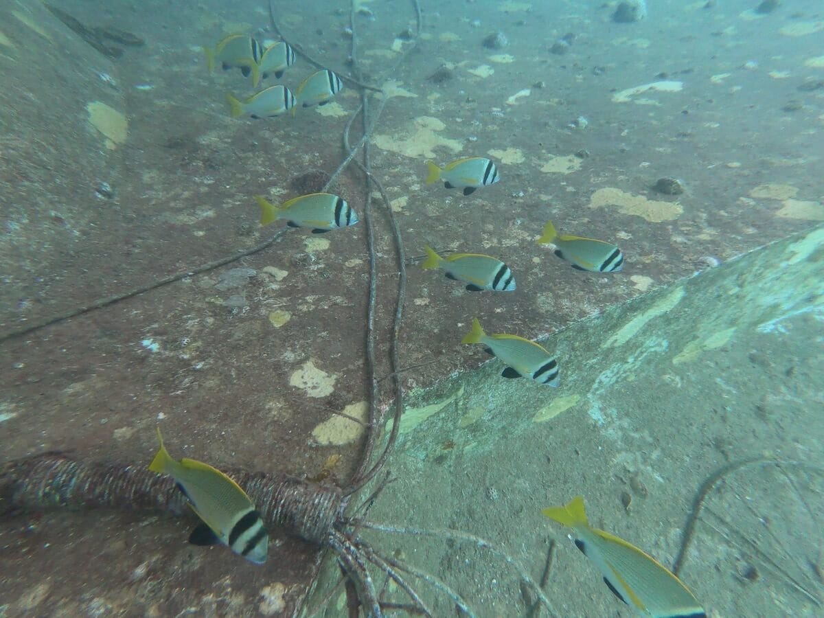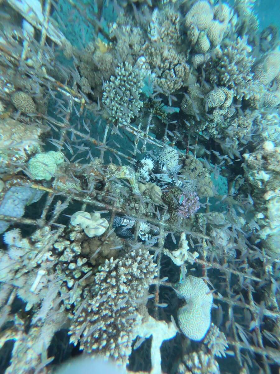 The underwater restaurant supports a diversity of fish and invertebrates. Schools of twobar seabream patrol the concrete platforms at the very top of the structure (↕4-7ft). Anemones inhabited by communities of Red Sea anemonefish are fixed near the windows (↕7-10ft). Further below, many lionfish hide in the coral, and emperor angelfish and yellow-ear angelfish shelter around the underwater cables.