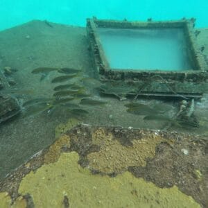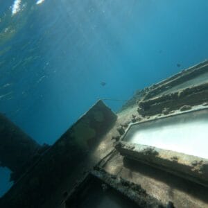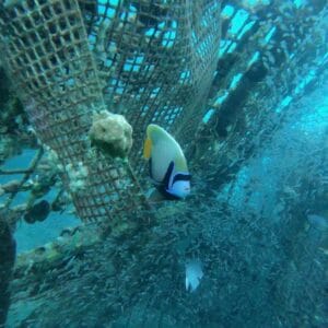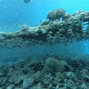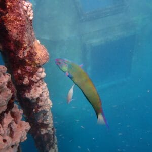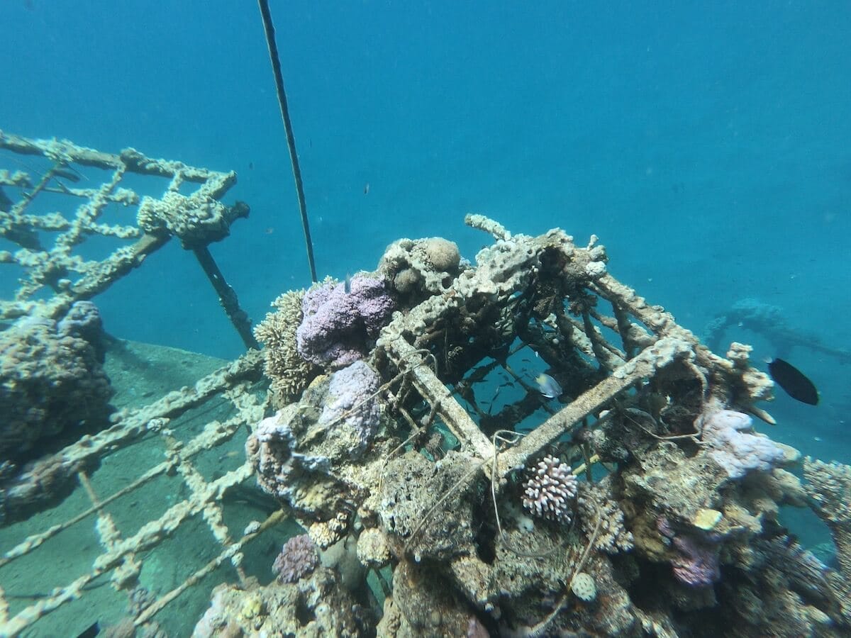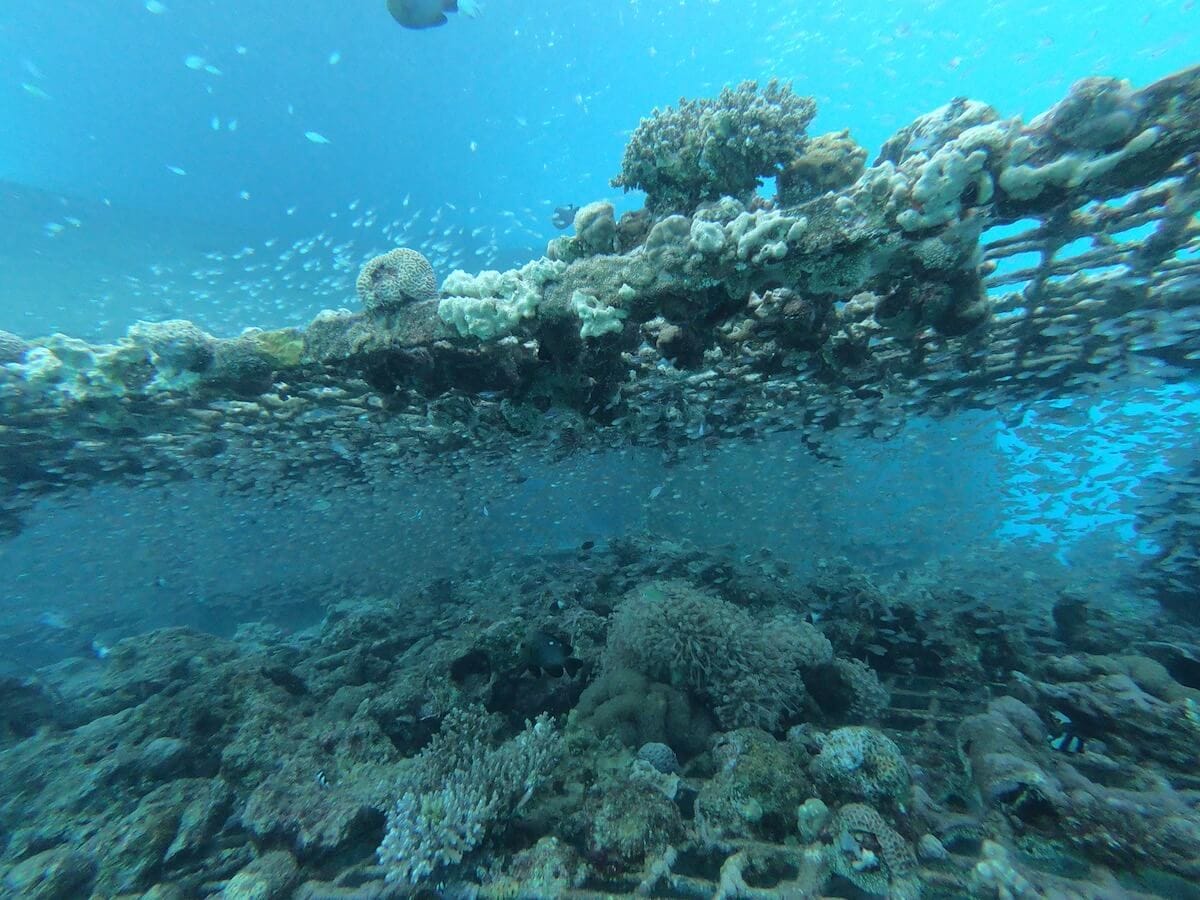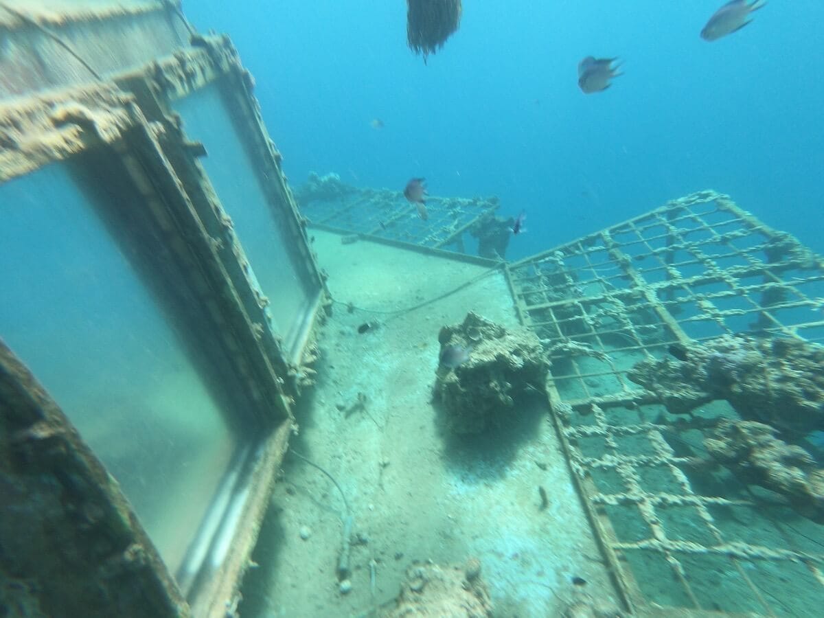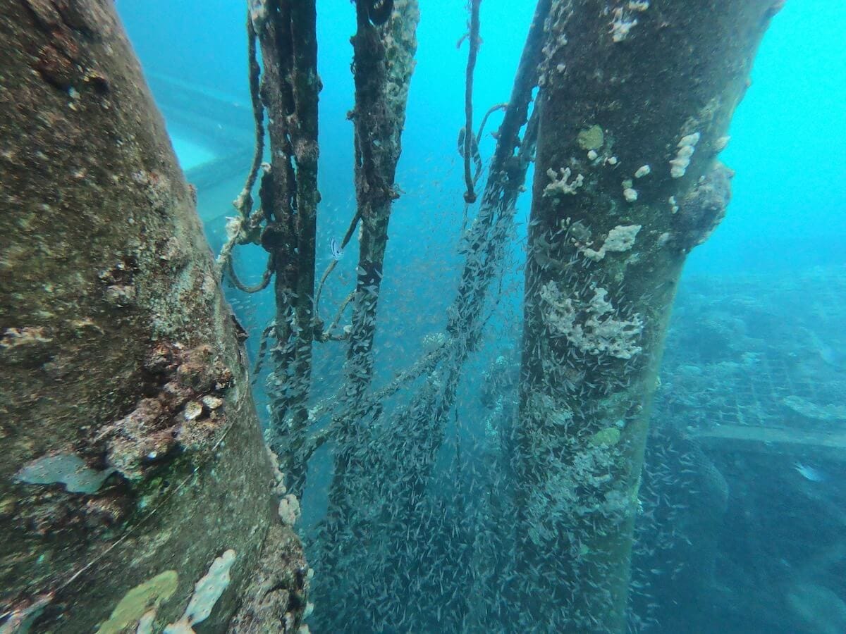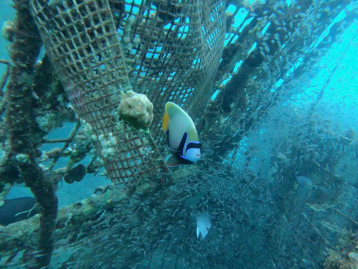 While the upper parts of the restaurant almost touch the surface, part of the construction sits nearly 65 ft below the surface, providing plenty of areas to explore. The structure is partially covered with coral and sponges, encouraged by the coral nurseries found on the small mesh platforms (↕10-13ft).