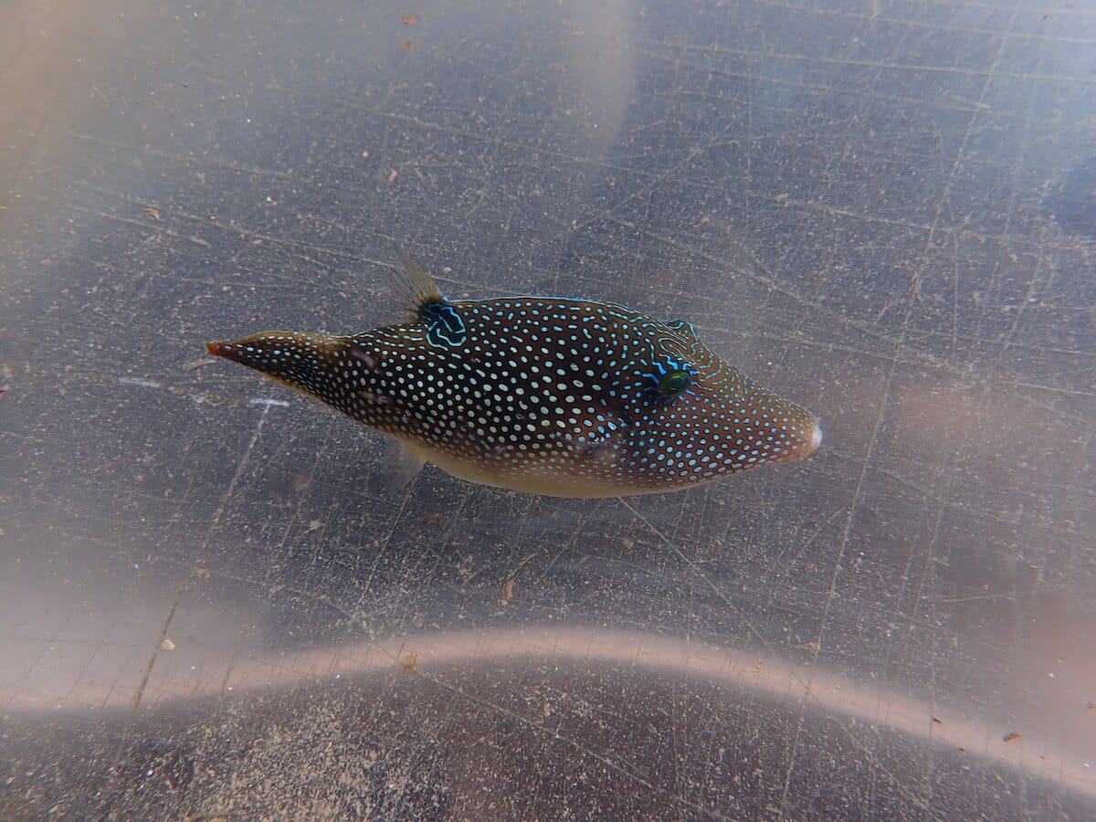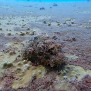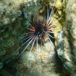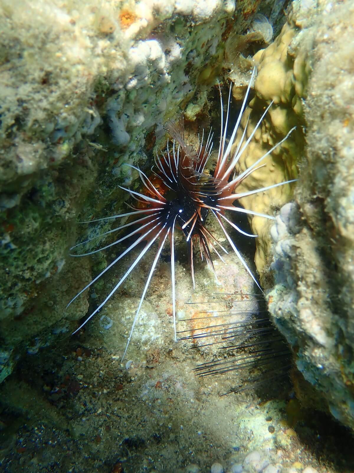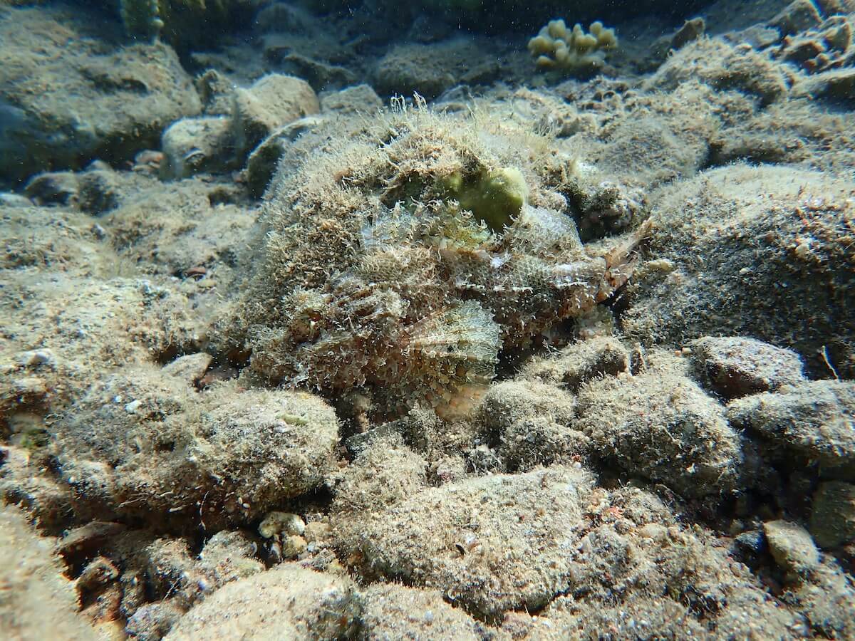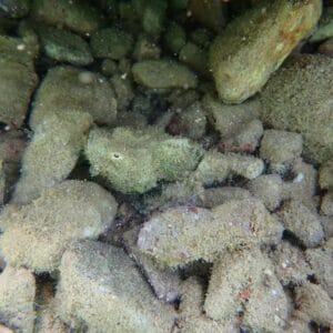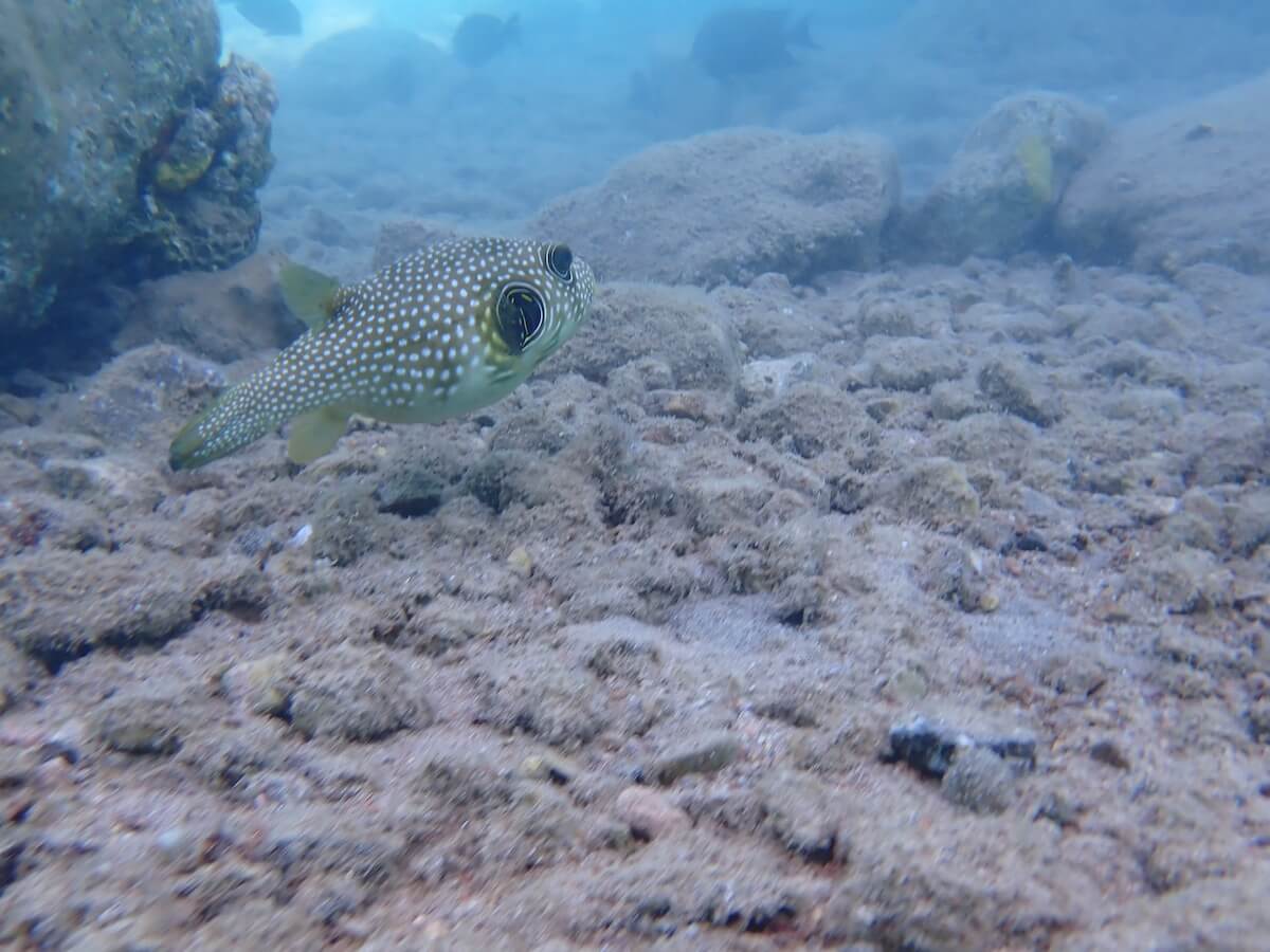 The rocky beds are also visited by pufferfish (several species, see comprehensive species list at the bottom of the page), wrasse, collector sea urchins, and occasional small moray eel and devil scorpionfish.