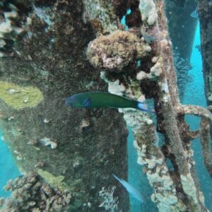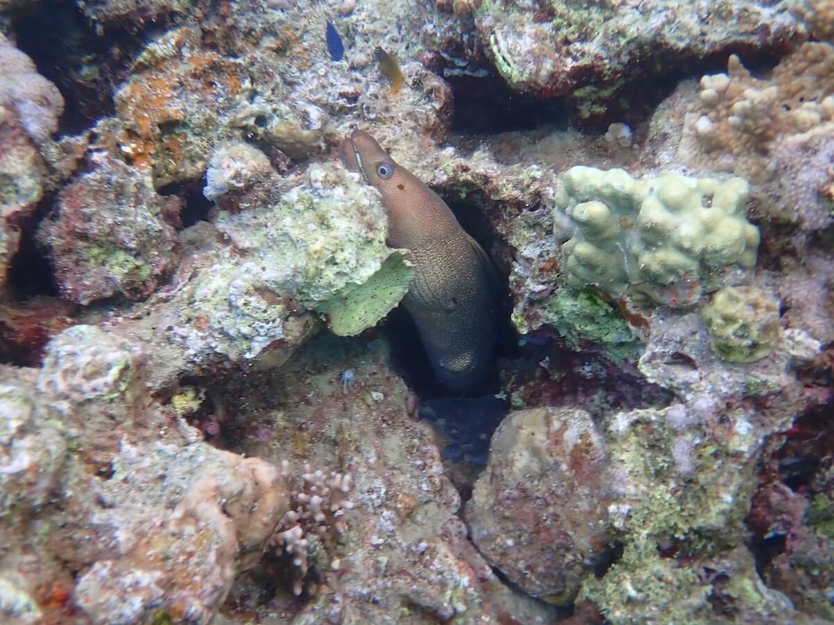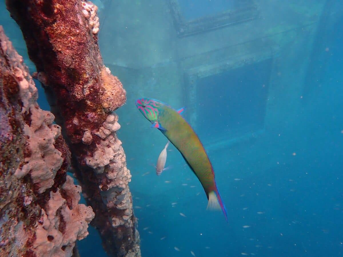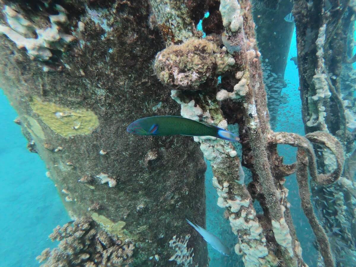Once you’ve explored the restaurant, swim towards the Aria Hotel jetty. You will get to shallower areas (↕1-10ft) that are poor in corals but visited by colorful fish. This area is popular with large clown coris, rusty parrotfish and purple-brown parrotfish, which all seem to enjoy the surroundings of the jetty.