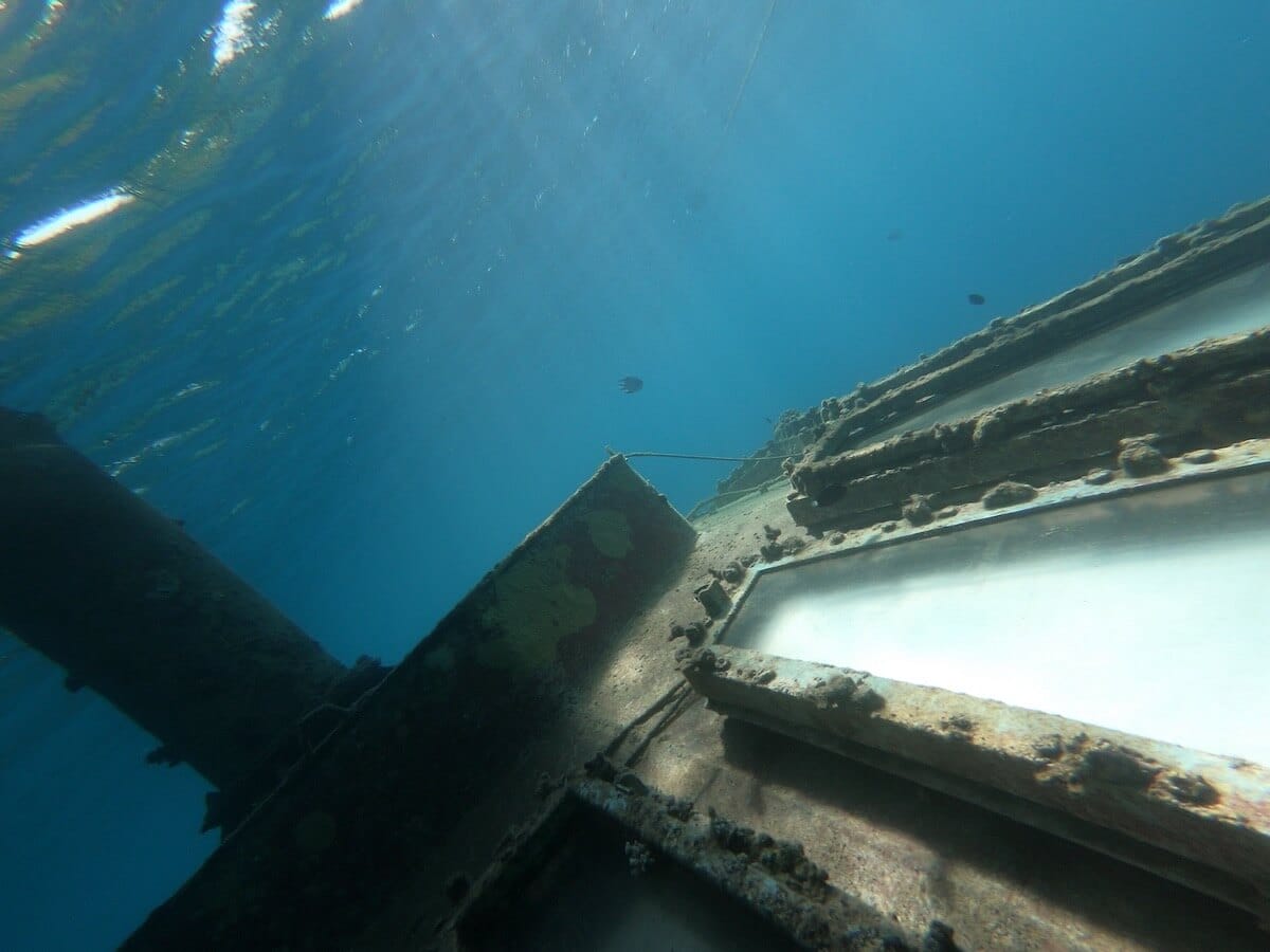 The main attraction of this spot is the abandoned underwater restaurant which is about 50 yards from the shore. This structure falls into the depths, and is surrounded by a tangle of platforms, pillars and cables. It seems straight out of a science fiction movie.