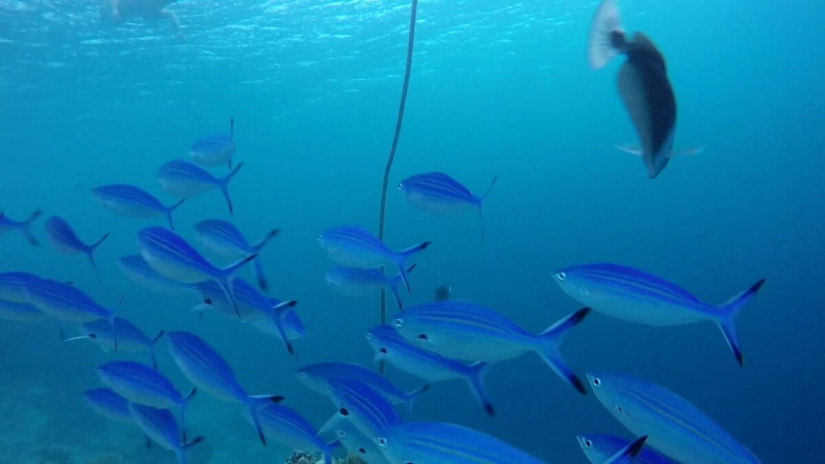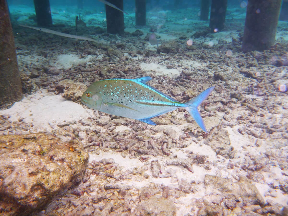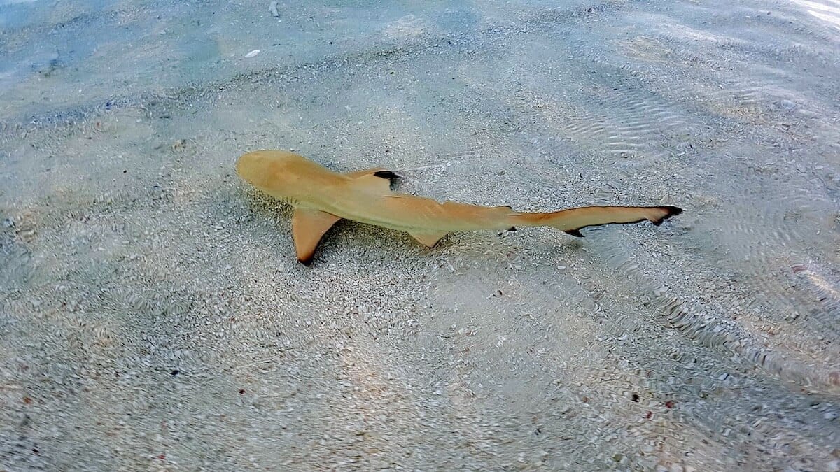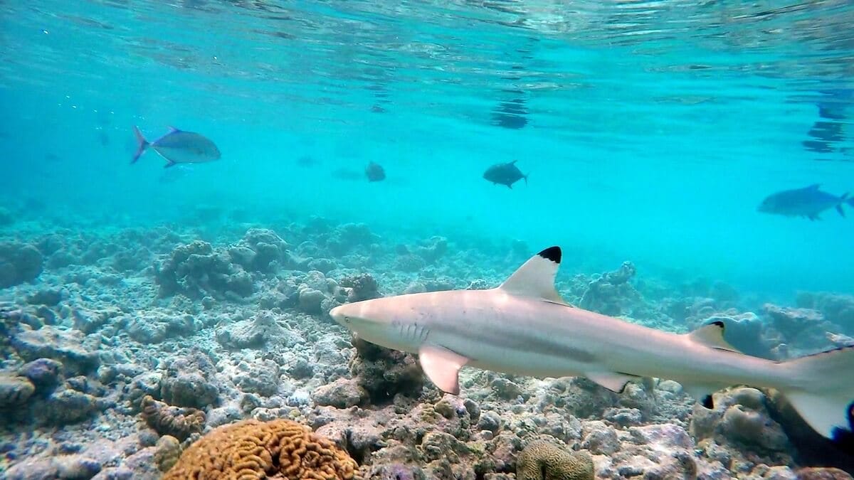 Schools of parrotfish, sixbar wrasses, rabbitfish and pufferfish can be seen amongst dozens of other tropical species. Small blacktip reef sharks also gather in certain areas of the coral flat, notably around the Asian Wok restaurant (see map, area marked “sharks zone”).
