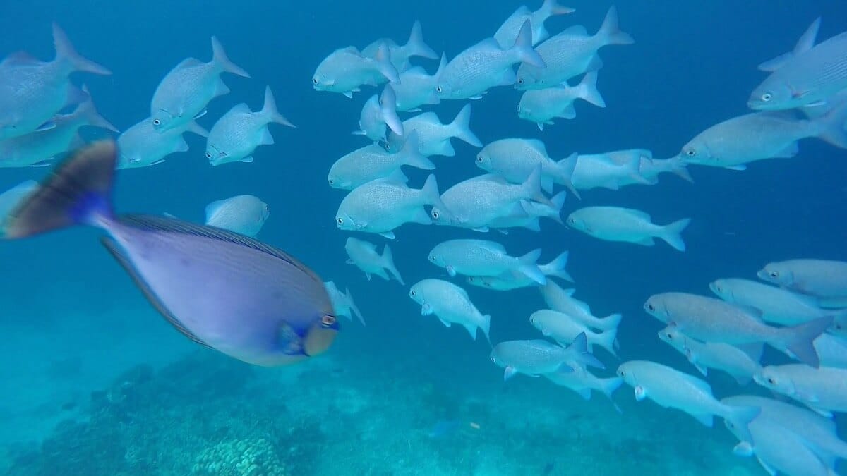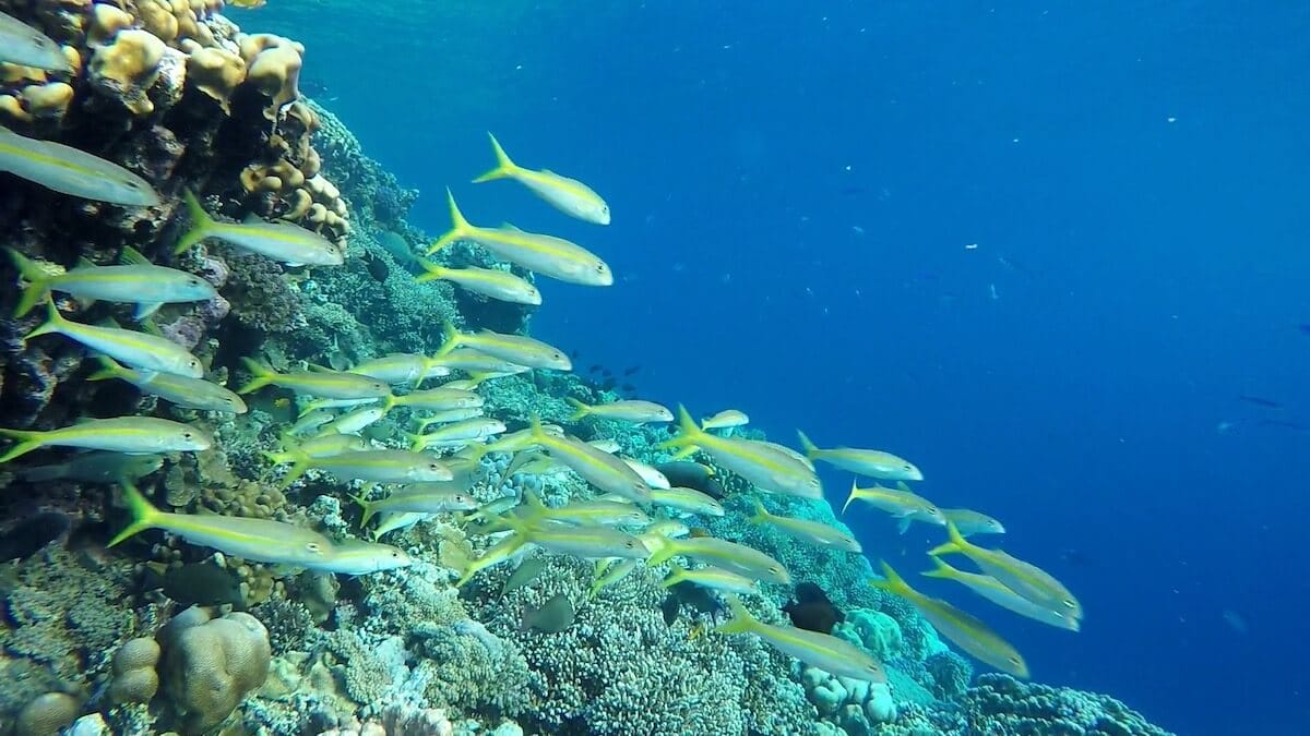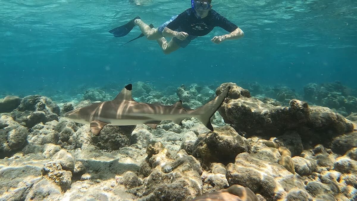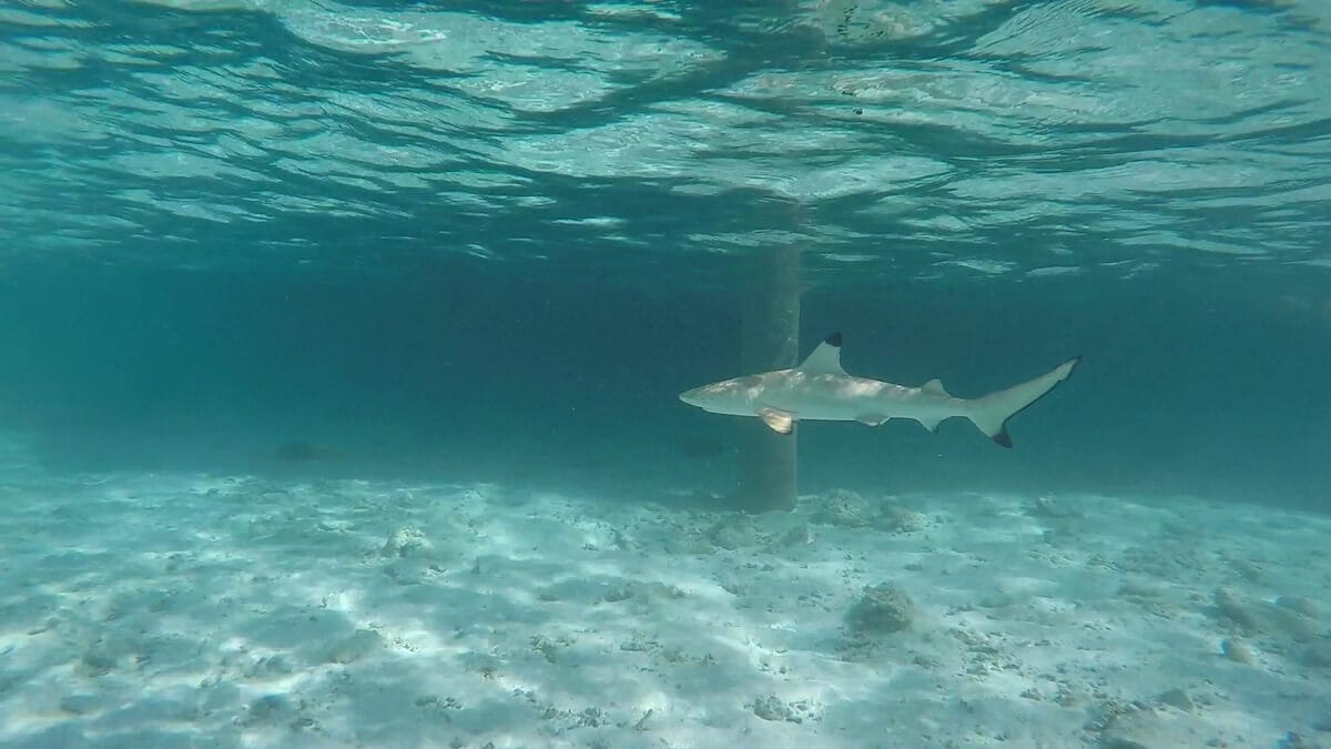Schools of parrotfish, sixbar wrasses, rabbitfish and pufferfish can be seen amongst dozens of other tropical species. Small blacktip reef sharks also gather in certain areas of the coral flat, notably around the Asian Wok restaurant (see map, area marked “sharks zone”).