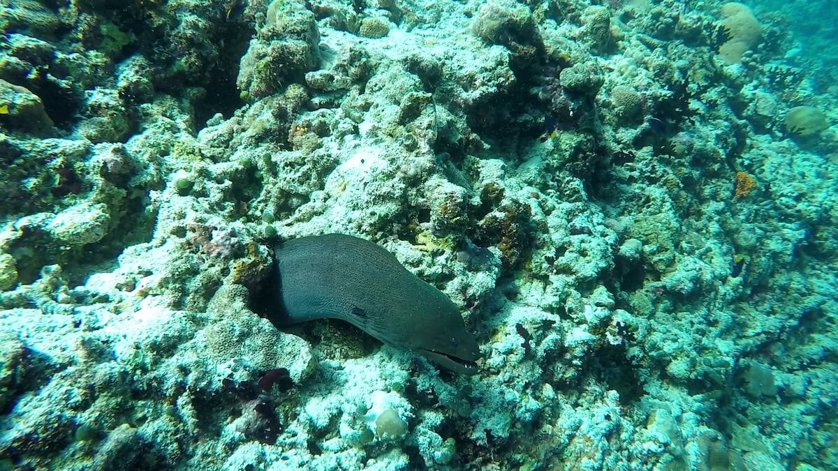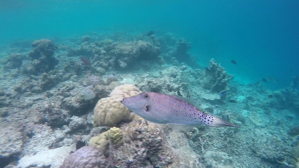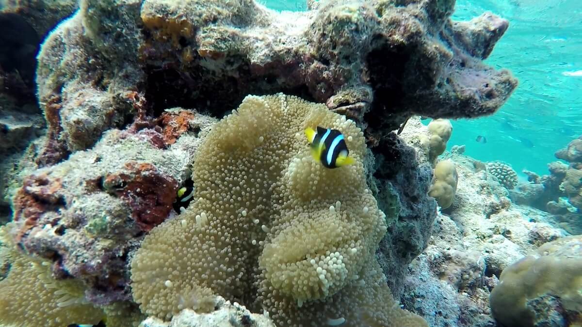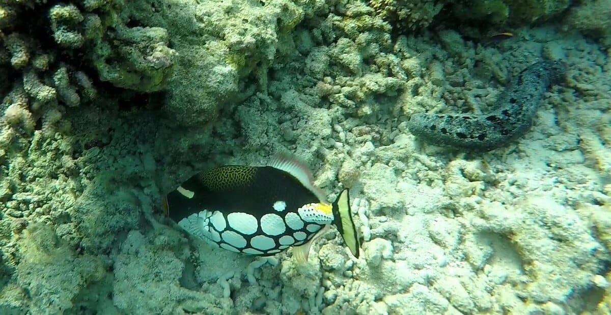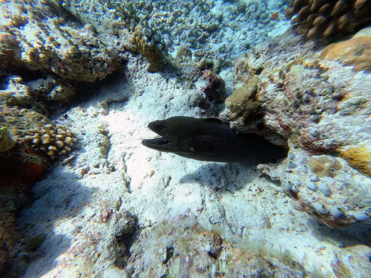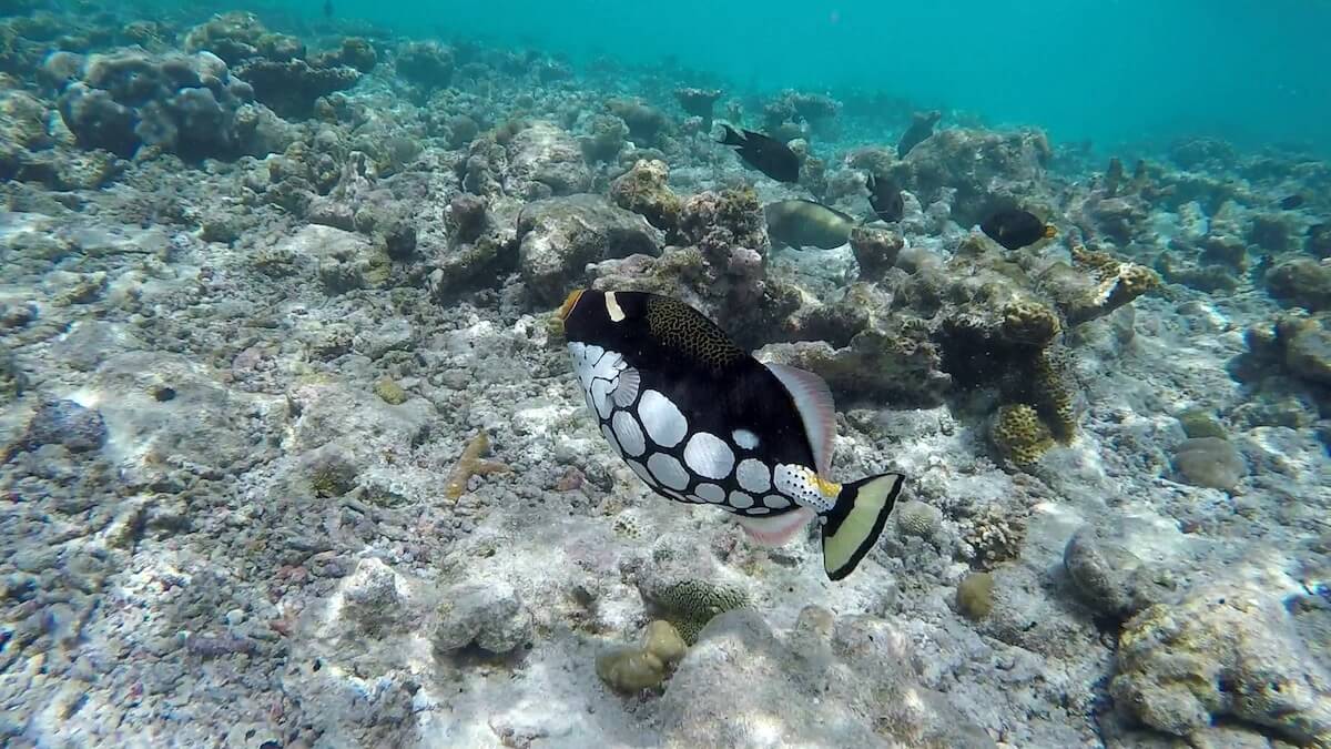 There are nice sightinga opportunities on the coral flat, but the reef drop-off is the place where sea life truly abounds. Swimming along the reef’s edge, you will maximize your chances to spot two clownfish species (Clark’s anemonefish and Maldives anemonefish), but also triggerfish, butterflyfish, porcupinefish, and many more.
