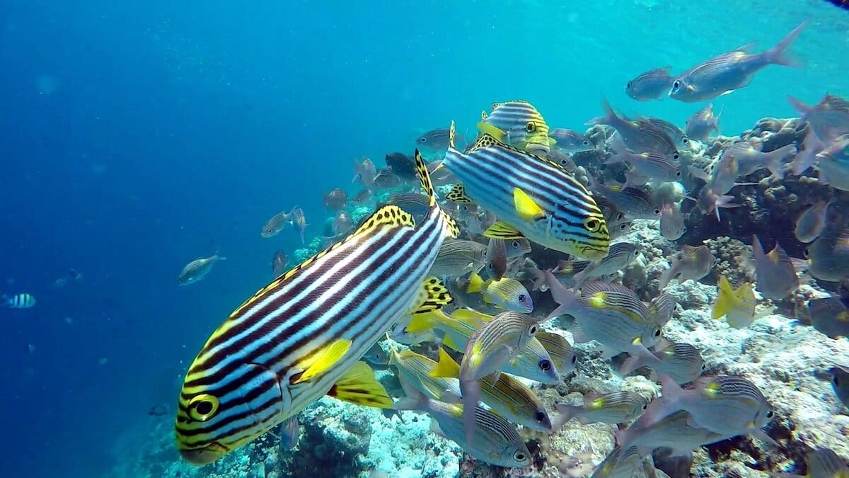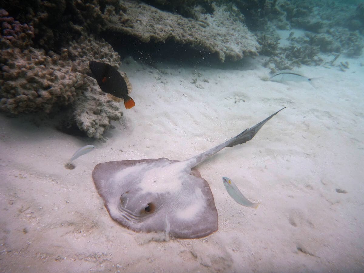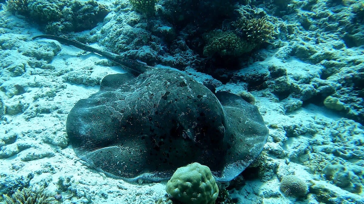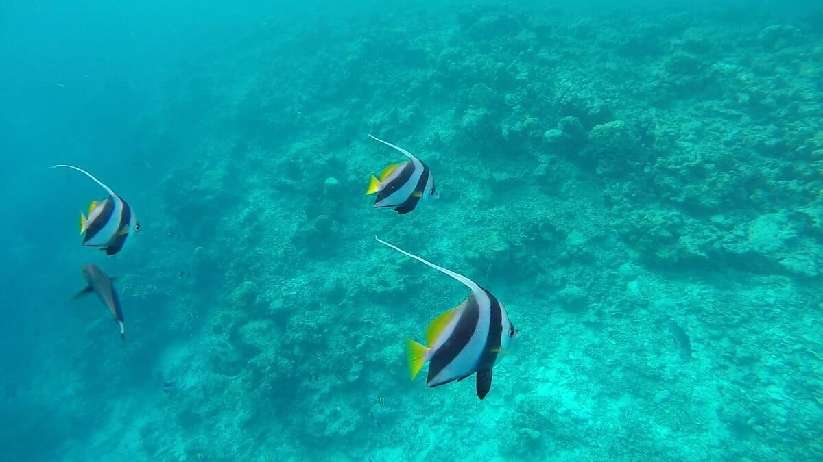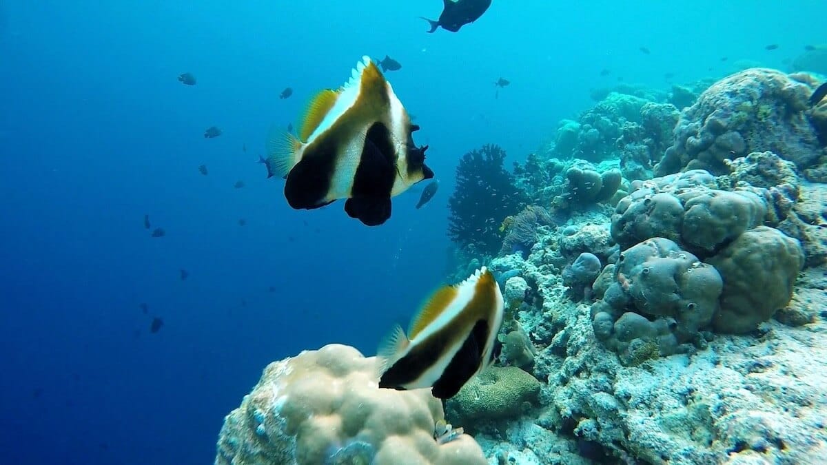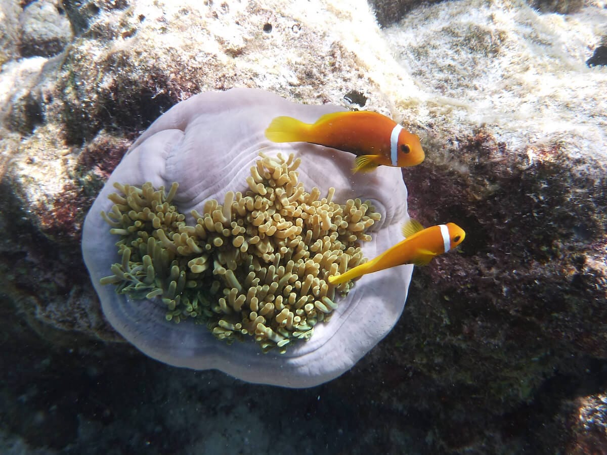 There are nice sightinga opportunities on the coral flat, but the reef drop-off is the place where sea life truly abounds. Swimming along the reef’s edge, you will maximize your chances to spot two clownfish species (Clark’s anemonefish and Maldives anemonefish), but also triggerfish, butterflyfish, porcupinefish, and many more.