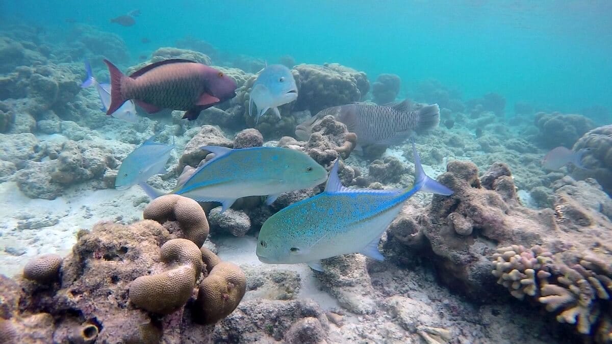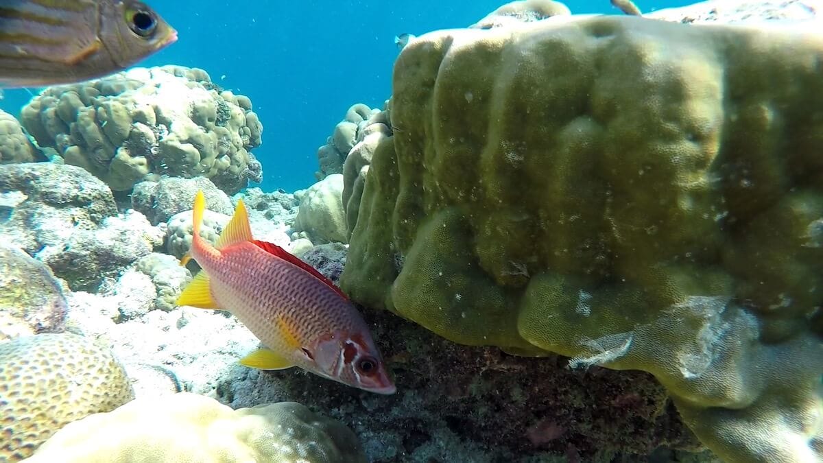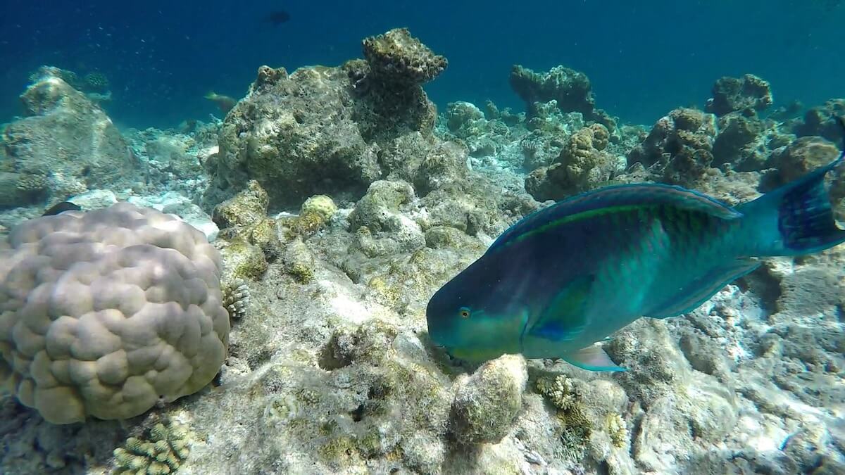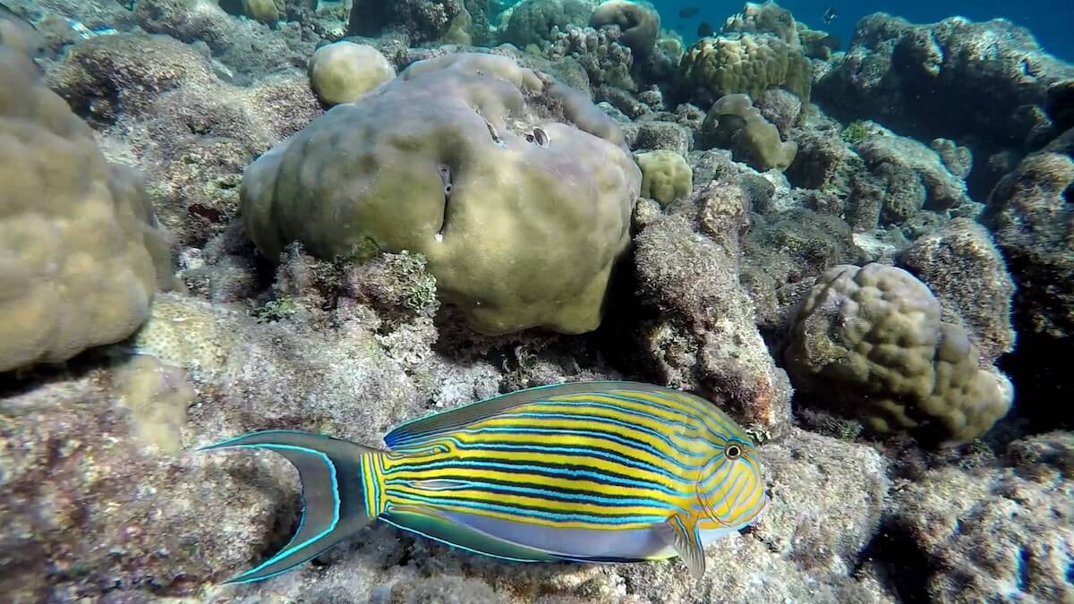 You can enter the water anywhere you like around the island, as it is entirely fringed by a coral reef. When the tide is high, you can enter the water directly from the beach. Low tide, however, doesn’t leave enough water depth to allow snorkeling on the reef flat. Luckily, 11 accesses have been carved in coral around the island.
