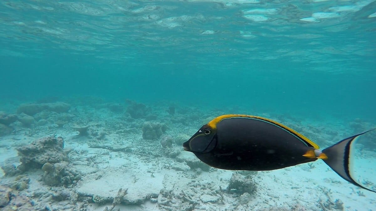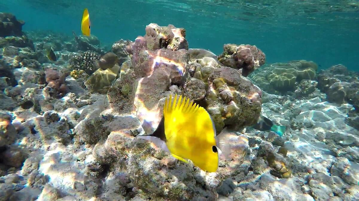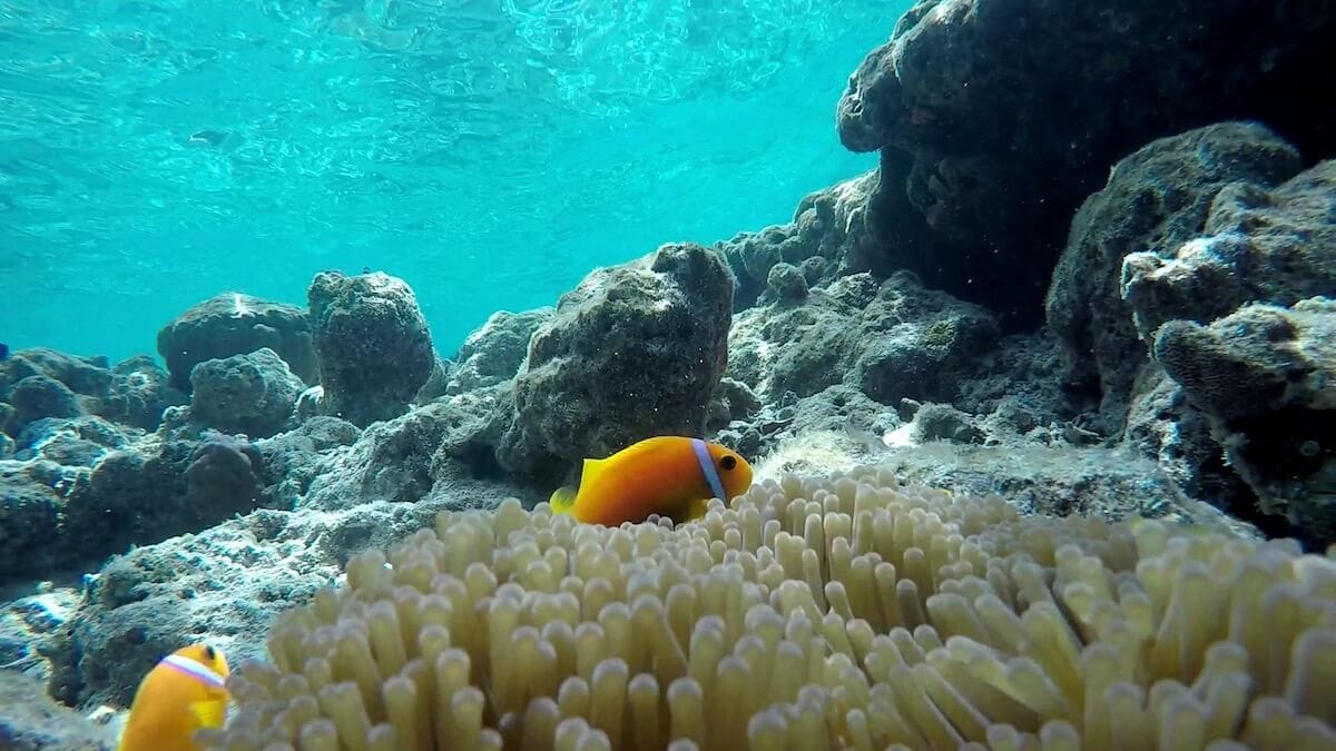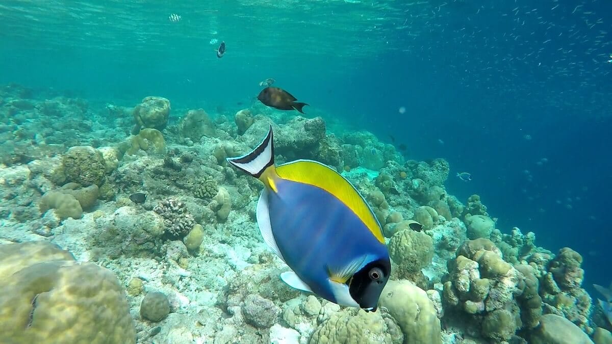 You can enter the water anywhere you like around the island, as it is entirely fringed by a coral reef. When the tide is high, you can enter the water directly from the beach. Low tide, however, doesn’t leave enough water depth to allow snorkeling on the reef flat. Luckily, 11 accesses have been carved in coral around the island.