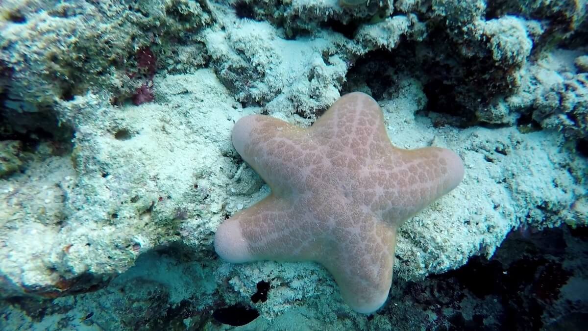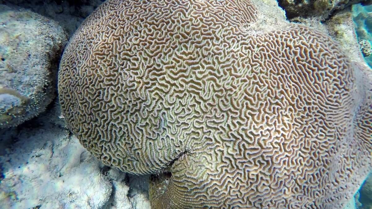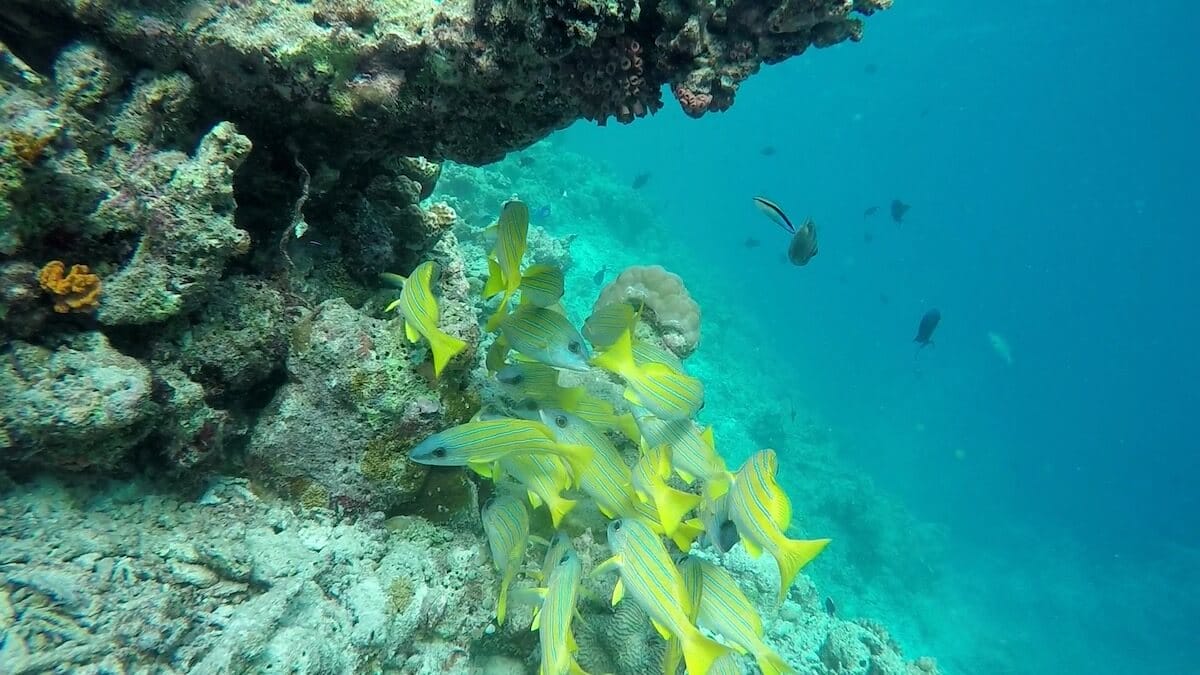 Coral health is variable on the drop-off. The island’s southwestern side (south of the water villas, see map above) remains the best-preserved area.