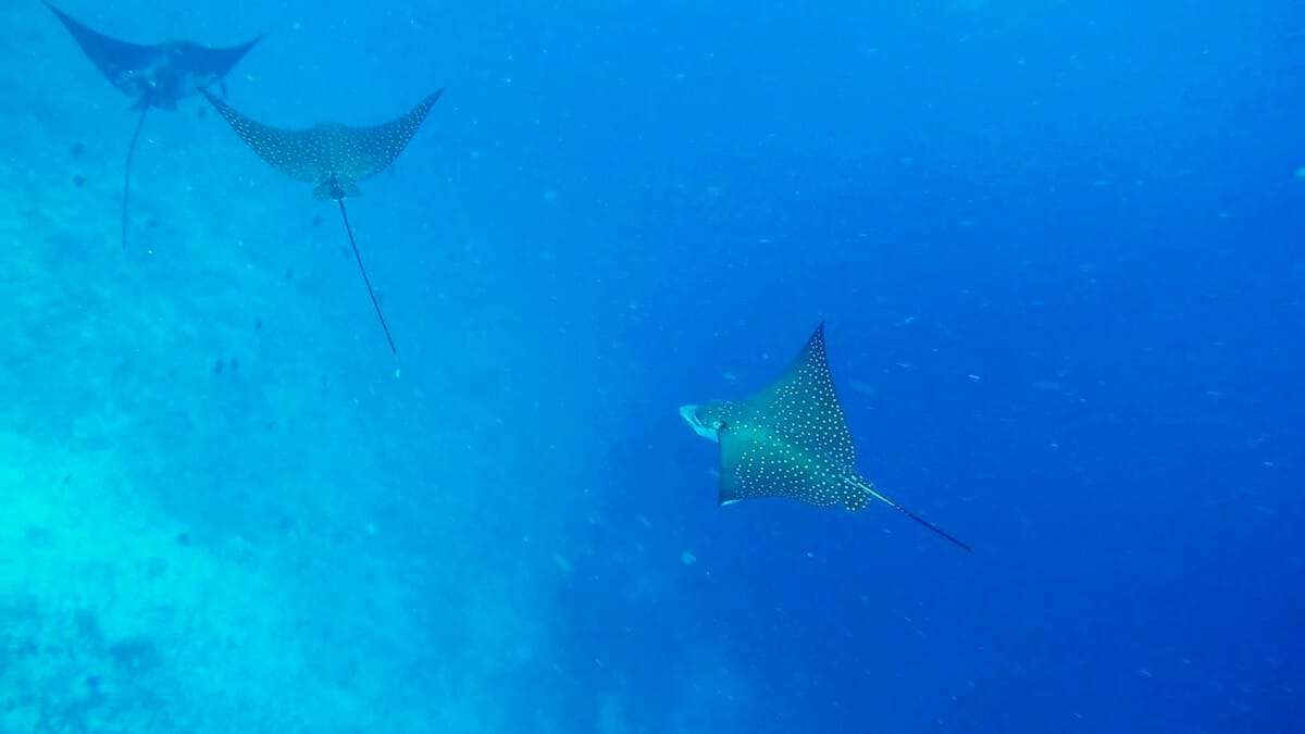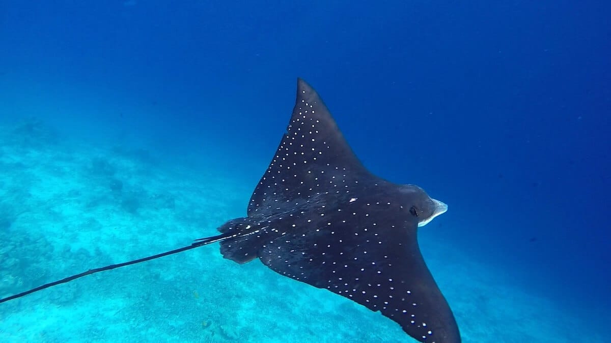 Radial firefish, false stonefish and moray eels sometimes hide underneath coral formations and inside rock crevices. As this area is open to the ocean, you might also spot bigger species such as spotted eagle rays, sharks (both blacktip and whitetip sharks), and sea turtles.