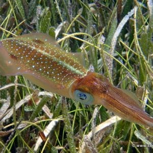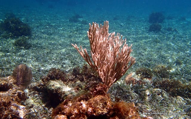 Starting from the beach, you will first come across a shallow sea meadow area sprinkled with coral clumps (↕0.5-1m). Cushion starfish like this place, although they are less numerous here than on Starfish Alley. Groups of Caribbean reef squids also appreciate this calm area sheltered from currents.